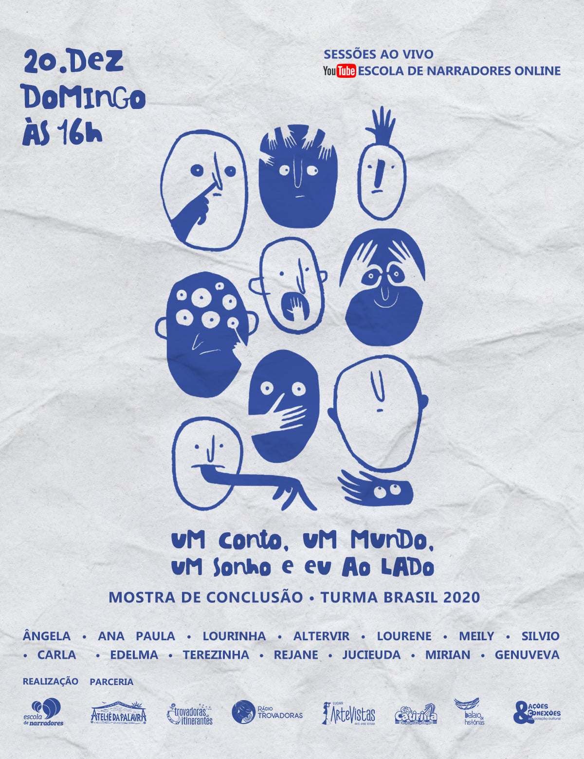 A partir de 2020, expandimos as nossas ações em formato online, alcançando três novas turmas (duas no Brasil e uma em Portugal), com mais 80 inscritos e um corpo docente especializado de cada país, além das atividades complementares que unem todas as turmas mensalmente com rodas de contos do mundo, ateliers e conversas com escritores somando 50 convidados e colaboradores.