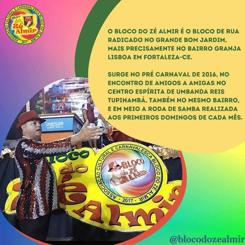 Fundado em 2016, o Bloco do Zé Almir vem desenvolvendo um trabalho de arte e cultura como bloco carnavalesco na Granja Lisboa, em Fortaleza. Inspirado na Umbanda e na cultura afro-brasileira, o bloco promove música, percussão, dança e a valorização do samba como expressão popular e periférica. Surgido de rodas de samba entre amigos, cresceu e conquistou espaço na “Passarela do Samba” da cidade — a Avenida Domingos Olímpio — principal palco do Carnaval de Rua de Fortaleza.