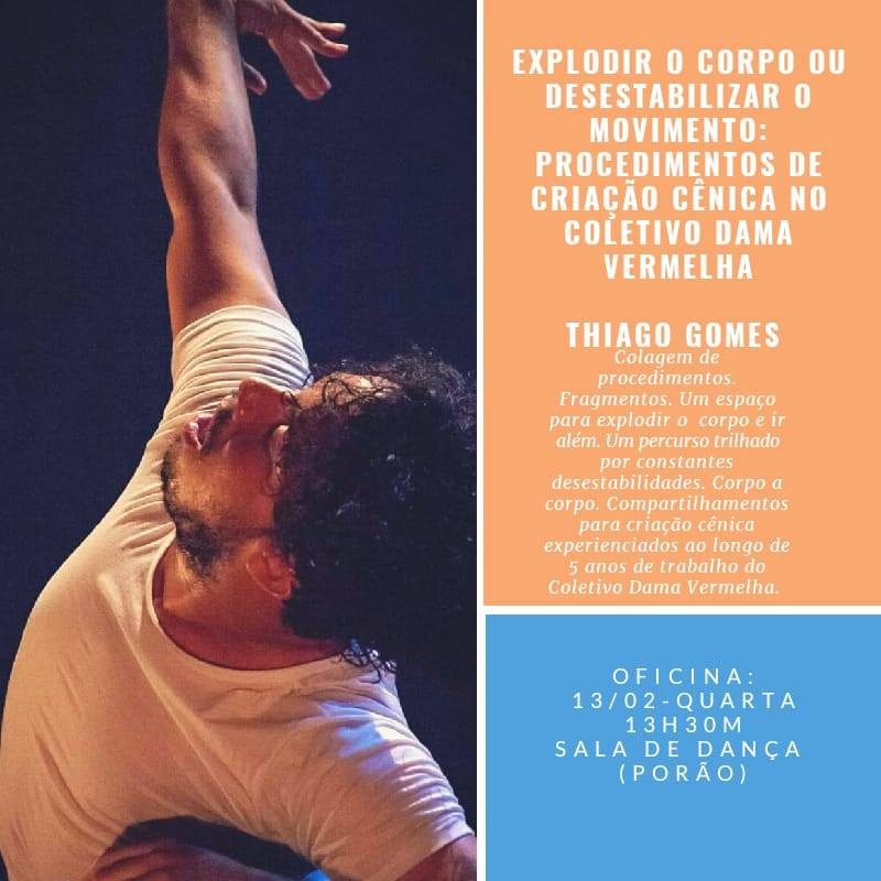 Graduado no Curso de Licenciatura em Teatro da Universidade Regional do Cariri (URCA). Mestre em Artes pela Universidade Regional do Cariri (URCA). Professor Efetivo na Secretaria de Educação do Ceará. Participou como bolsista no Projeto de Pesquisa "Pedagogia do Ator e Pedagogia do Teatro em Diálogo" (PIBIC/URCA) no ano de 2017. Encenador/Intérprete-Criador no Coletivo Dama Vermelha (2013-). Intérprete-criador na Inspire Cia. de Dança (2013-). Participou como bailarino na Cia. Alysson Amancio (2013-2015). Participou do Núcleo de Estudos e Experimentos Teatrais – Sesc Juazeiro do Norte (2010-2014). Foi bolsista no Programa de Extensão “O Prazer da Arte” – Linha Dança Educação - GPEACC (2013-2014) e no Programa Institucional de Bolsas de Iniciação à Docência (PIBID/Teatro). Desenvolve pesquisas no hibridismo entre Dança Contemporânea, Teatro e Performance.https://thiagogomez.jimdofree.com/