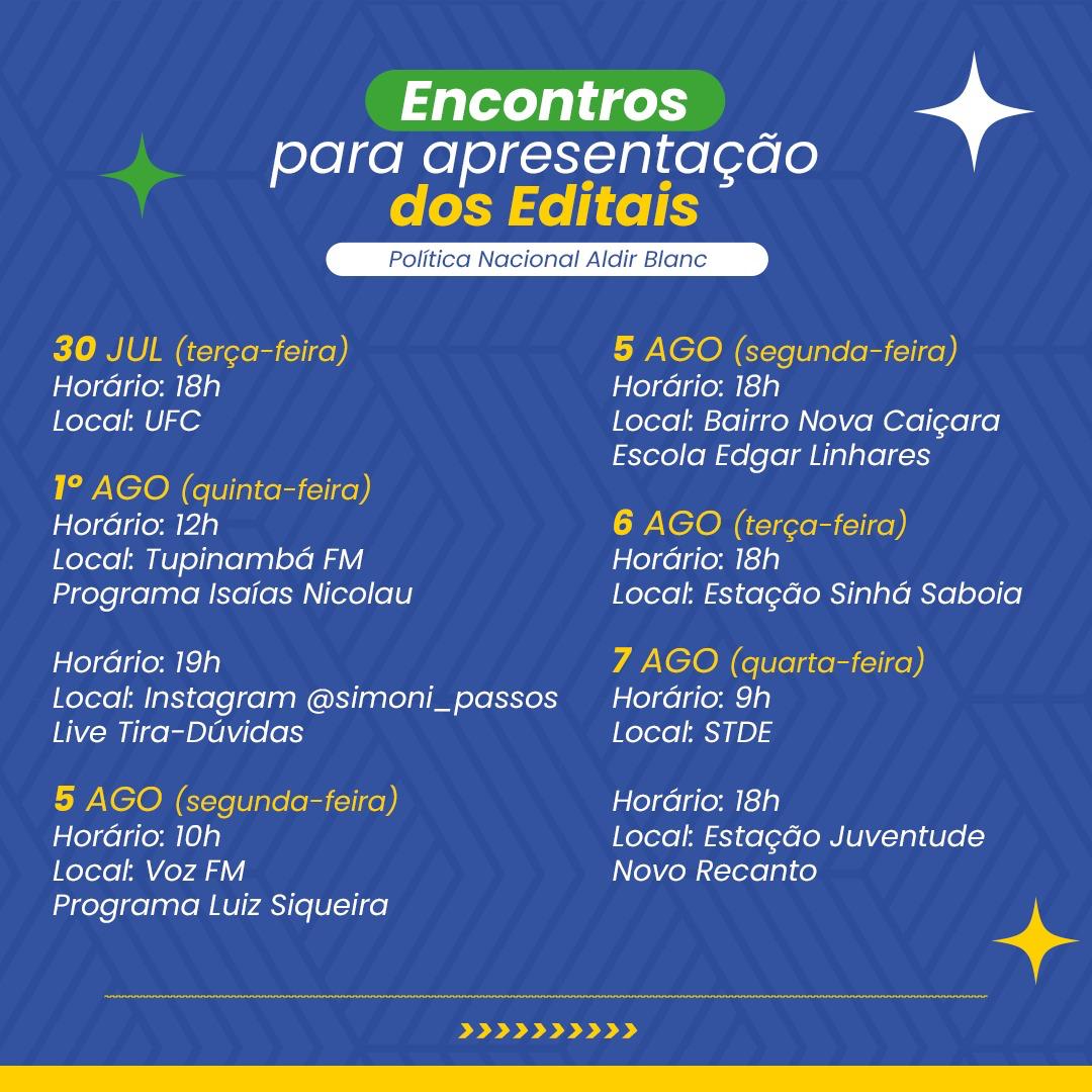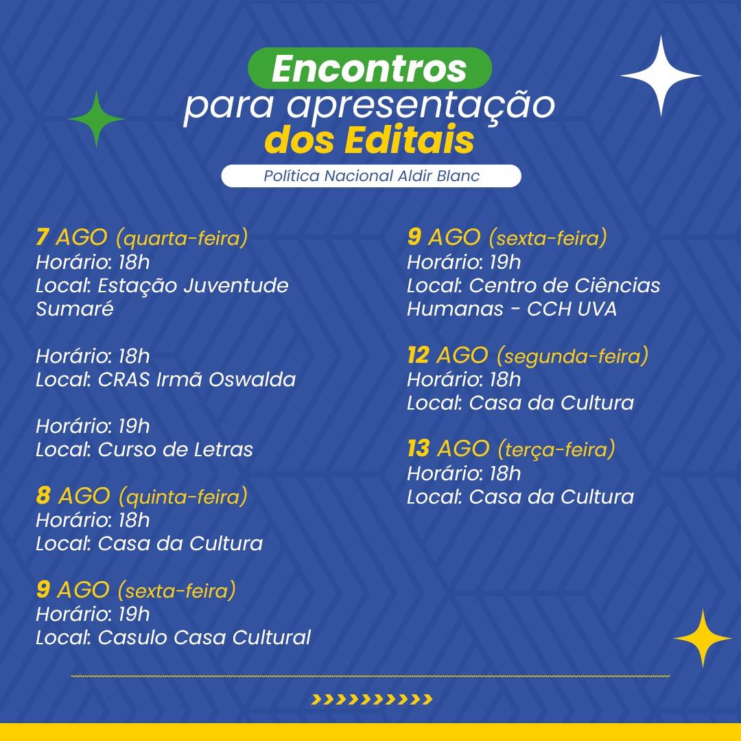 Os encontros de mobilização e apresentação dos editais da Política Nacional Aldir Blanc Sobral foram momentos importantes para apresentar os editais à comunidade artística e esclarecer dúvidas, promovendo a transparência e o acesso às oportunidades culturais no município