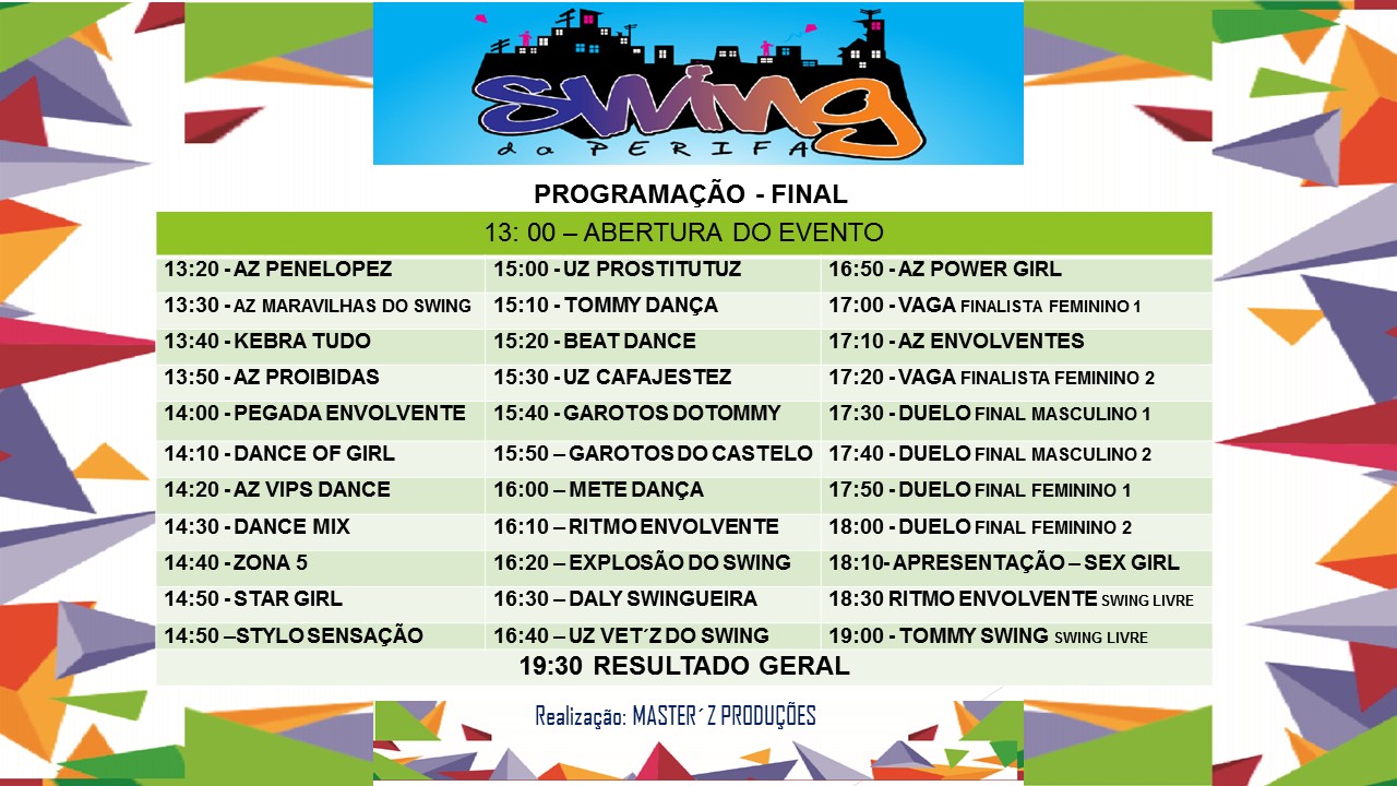 Inscrições: As inscrições serão feitas em duas modalidades: swingueira livre e swing kebradeira.