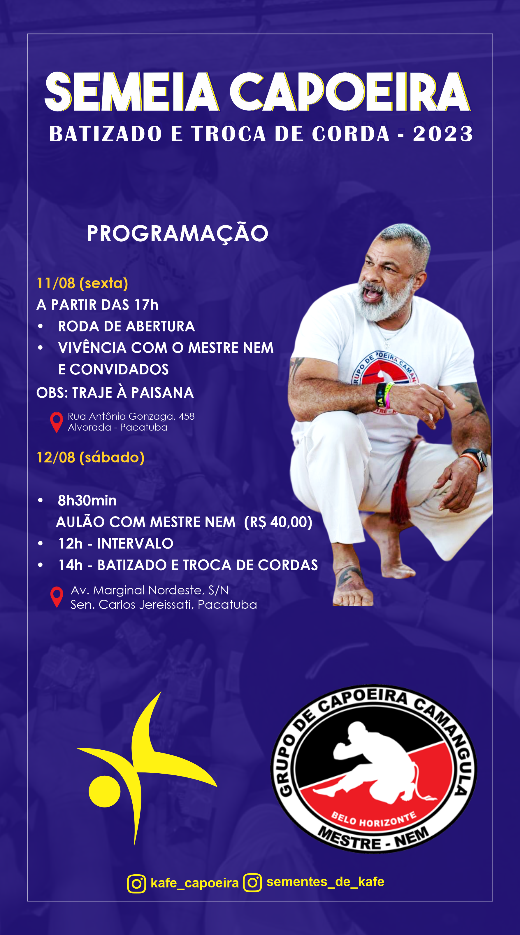 O Semeia Capoeira é o evento anual de Batizado e Troca de Corda em que os alunos são apresentados a comunidade da capoeira e interagem com outros grupos, proporcionando assim encontros intergeracionais.A partir dele os alunos recebem sua corda conforme sua graduação, valorizando assim os esforços realizado no decorrer do ano. A primeira edição ocorreu nos dias 11 e 12 de agosto de 2023, apresentando convidados internacionais e contando com o apoio da prefeitura de Pacatuba e de membros da sociedade civil. O evento aconteceu em 2 dias, no primeiro dia tivemos uma roda de abertura e vivência com Fundador do grupo Mestre Nem e no 2º dia tivemos um aulão e os batizados.