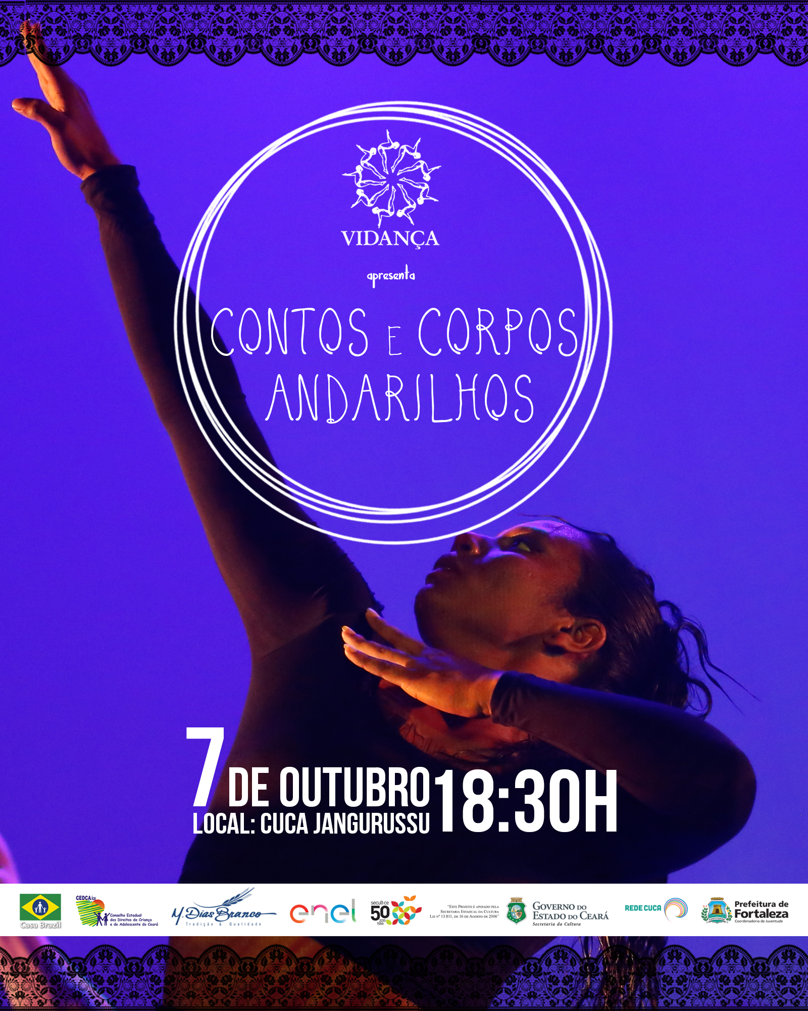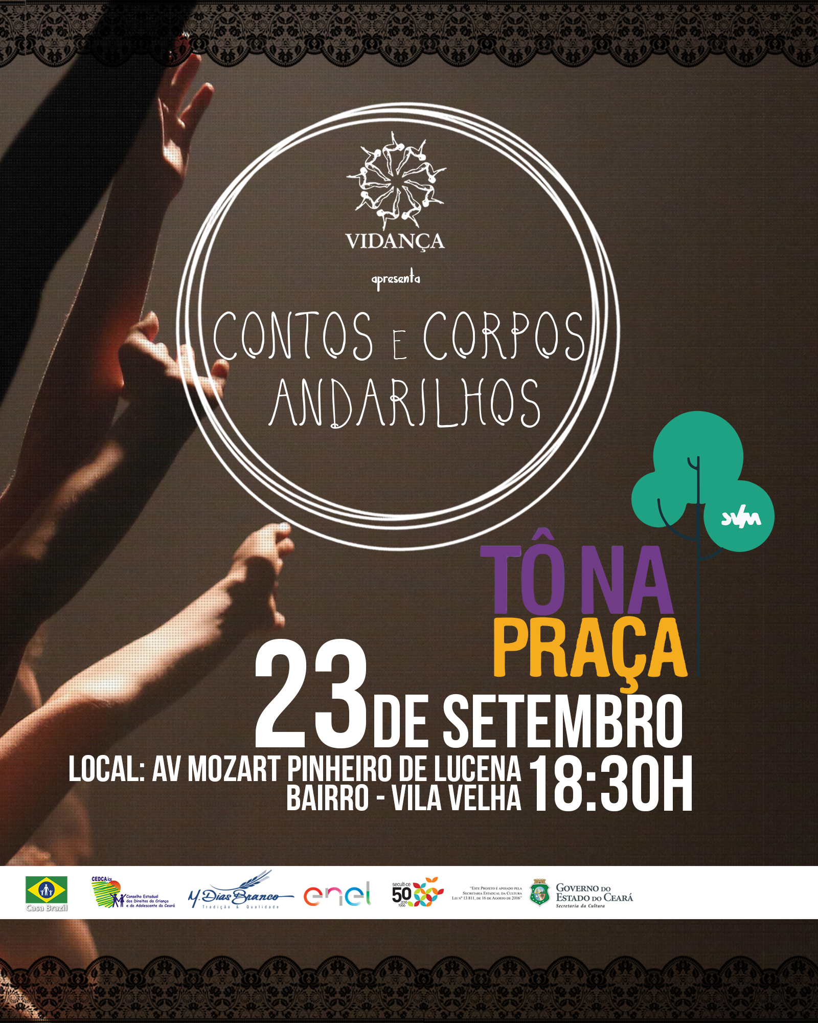 Este projeto atende 150 participantes, todas residentes da Associação Vidança. O acesso às aulas e as oficinas são gratuitos. Além das oficinas e aulas, ao longo do ano serão realizadas seis pequenas apresentações dos alunos, sempre com entrada franca e abertas ao público, em locais como as escolas públicas e praças.Ao final das atividades de formação haverá uma Mostra na Praça do Vila Velha, com a apresentação do Espetáculo "Contos e Corpos Andarilhos". Este projeto terá duração de (06) seis meses, devendo ter continuidade posterior. As oficinas, aulas e ensaios serão realizados nas dependências da sede da própria Associação.